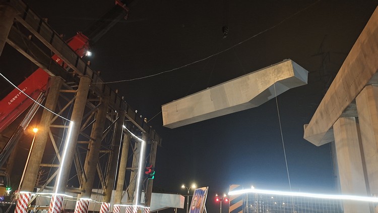 【概要描述】2023年3月2日凌晨三點(diǎn)半,在現(xiàn)場管理人員有條不紊的指揮下,最后一個(gè)梁段緩慢而精準(zhǔn)落位,標(biāo)志著跨洋江西路口疊合梁順利吊裝完畢。該疊合梁長55m,共有6榀鋼梁組成,此次總共分成3小跨18個(gè)梁段進(jìn)行吊裝,總重約480噸。