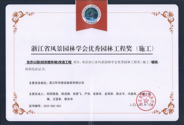 【概要描述】3月4日,浙江省風(fēng)景園林學(xué)會(huì)第十一屆“園林人居”論壇暨2022年度“優(yōu)秀園林工程獎(jiǎng)”頒獎(jiǎng)大會(huì)在杭州之江飯店召開。我司承建的生態(tài)公園(延安路東端)改造工程榮獲浙江省風(fēng)景園林學(xué)會(huì)2022年度“優(yōu)秀園林工程獎(jiǎng)銀獎(jiǎng)”。