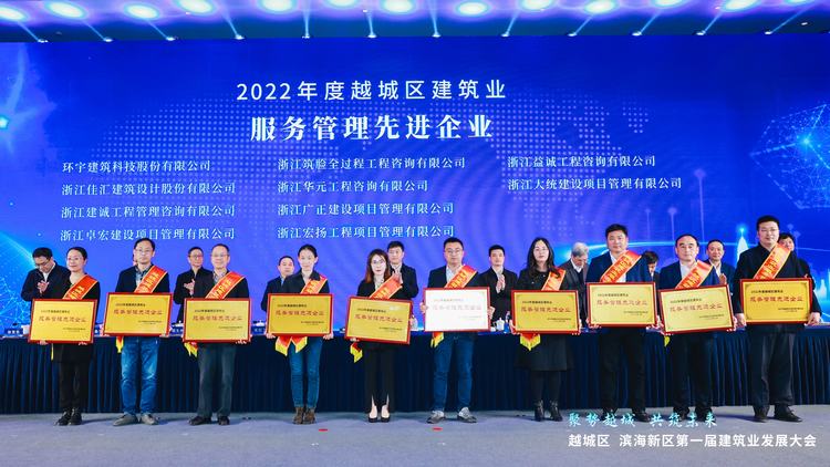 會議總結(jié)了2022年越城區(qū)建筑業(yè)的各項工作,并表彰了2022年度越城區(qū)建筑業(yè)領(lǐng)軍企業(yè)等各類先進(jìn)企業(yè)、優(yōu)秀建造師和優(yōu)秀總監(jiān)。浙江環(huán)宇建設(shè)集團(tuán)有限公司榮獲“2022年度越城區(qū)建筑業(yè)領(lǐng)軍企業(yè)”、環(huán)宇建筑科技股份有限公司榮獲“2022年度越城區(qū)建筑業(yè)服務(wù)管理先進(jìn)企業(yè)”,集團(tuán)董事長宋良榮獲“2022年度越城區(qū)建筑業(yè)突出貢獻(xiàn)獎”,第三工程公司褚永勝榮獲“2022年度越城區(qū)建筑業(yè)優(yōu)秀建造師”的榮譽(yù)稱號。