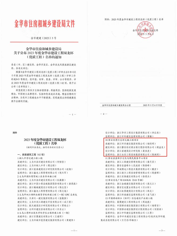 近日,金華市住房和城鄉(xiāng)建設(shè)局發(fā)布《關(guān)于公布2023年度金華市建設(shè)工程雙龍杯(優(yōu)質(zhì)工程)名單的通知》,由我司承建的磐安農(nóng)商行總部大樓工程項(xiàng)目榮獲2023年度金華市建設(shè)工程“雙龍杯”優(yōu)質(zhì)工程獎(jiǎng)。