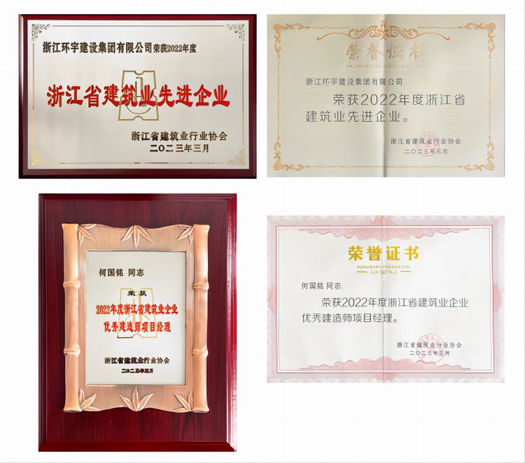 【概要描述】日前,浙江省建筑業(yè)行業(yè)協(xié)會(huì)下發(fā)了《關(guān)于公布和表彰2022年度浙江省建筑業(yè)先進(jìn)企業(yè)、浙江省建筑業(yè)優(yōu)秀企業(yè)家、浙江省建筑企業(yè)優(yōu)秀建造師項(xiàng)目經(jīng)理的通知》,浙江環(huán)宇建設(shè)集團(tuán)有限公司榮獲“2022年度浙江省建筑業(yè)先進(jìn)企業(yè)”,集團(tuán)第一工程公司項(xiàng)目經(jīng)理何國銘獲評(píng)“2022年度浙江省建筑業(yè)企業(yè)優(yōu)秀建造師項(xiàng)目經(jīng)理”榮譽(yù)稱號(hào)。
