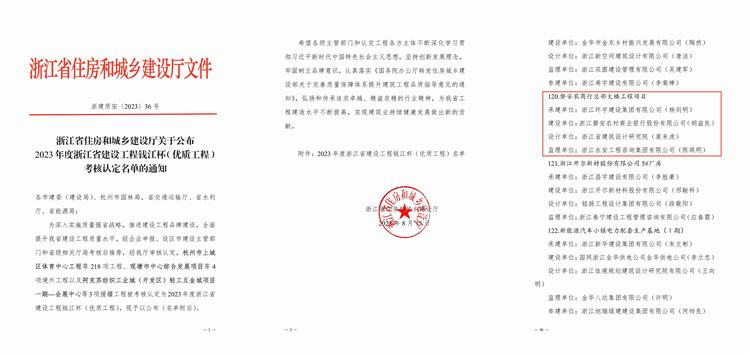 近日,浙江省住房和城鄉(xiāng)建設(shè)局發(fā)布《2023年度浙江省建設(shè)工程錢江杯(優(yōu)質(zhì)工程)考核認定名單的通知》,由我司承建的磐安農(nóng)商行總部大樓工程項目榮獲2023年度浙江省建設(shè)工程“錢江杯”優(yōu)質(zhì)工程獎!