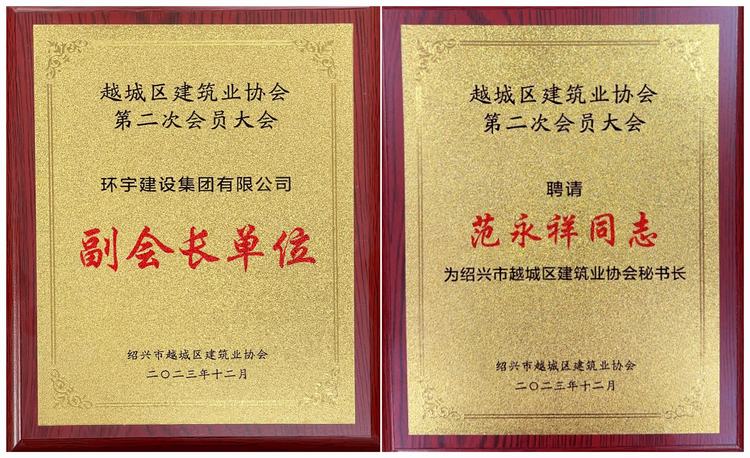 喜訊——環(huán)宇集團(tuán)當(dāng)選為紹興市越城區(qū)建筑業(yè)協(xié)會副會長單位、集團(tuán)常務(wù)副總經(jīng)理范永祥擔(dān)任紹興市越城區(qū)建筑業(yè)協(xié)會副會長并兼任秘書長