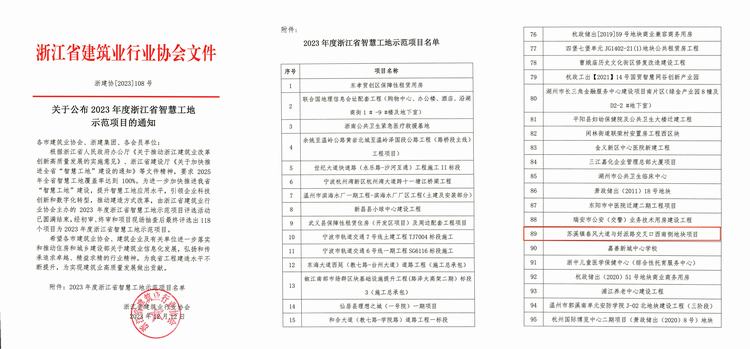 近日,浙江省建筑業(yè)協(xié)會發(fā)布《關于2023年度獲浙江省智慧工地示范項目名單的公示》,我司蘇溪鎮(zhèn)春風大道與好派路交叉口西南側地塊項目榮獲2023年度浙江省智慧工地示范項