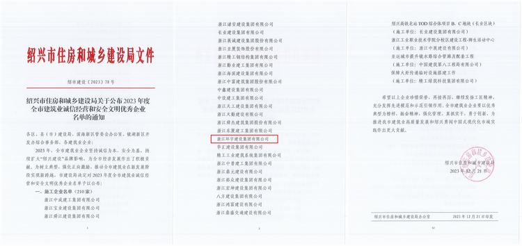 【概要描述】近日,紹興市住房和城鄉(xiāng)建設(shè)局發(fā)布《關(guān)于公布2023年度全市建筑業(yè)誠信經(jīng)營和安全文明優(yōu)秀企業(yè)名單的通知》,環(huán)宇集團位列其中,誠信建設(shè)再添殊榮。