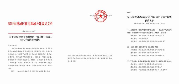 近日,紹興市越城區(qū)住房和城鄉(xiāng)建設(shè)局公布了《關(guān)于公布2023年度越城區(qū)“稽山杯”優(yōu)質(zhì)工程獎(jiǎng)評(píng)選結(jié)果的通知》。由我司承建的陽明故里整體開發(fā)建設(shè)項(xiàng)目——陽明故居及紀(jì)念館項(xiàng)目榮獲2023年度紹興市越城區(qū)“稽山杯”優(yōu)質(zhì)工程獎(jiǎng)。