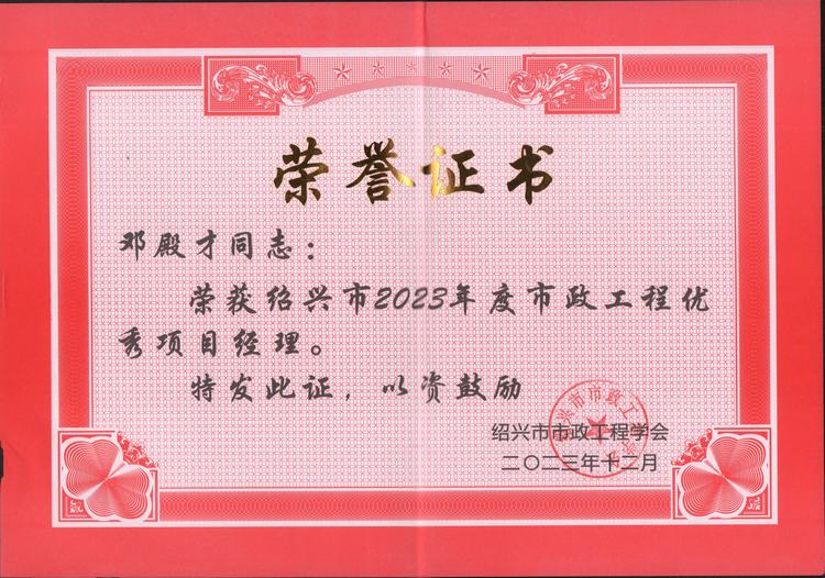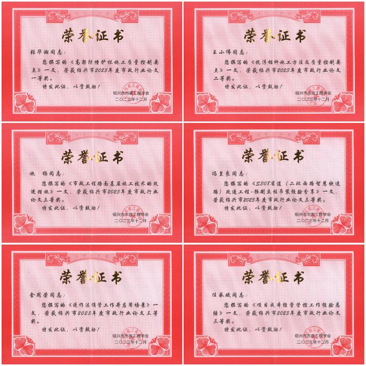 環(huán)宇集團榮獲2023年紹興市市政行業(yè)先進單位,鄧殿才榮獲2023年紹興市市政工程優(yōu)秀項目經(jīng)理,張華潮撰寫的《高架防撞護欄施工質(zhì)量控制要點》榮獲紹興市市政行業(yè)優(yōu)秀論文一等獎,王小偉撰寫的《抗浮錨桿施工方法及質(zhì)量控制要點》榮獲優(yōu)秀論文二等獎,施楊、馮皇良、金周榮、任承斌四人撰寫的論文榮獲優(yōu)秀論文三等獎。