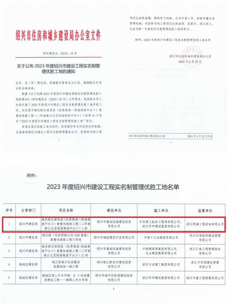 近日,紹興市住房和城鄉(xiāng)建設(shè)局公布2023年度紹興市建設(shè)工程實(shí)名制管理優(yōu)勝工地,我司與中交三航局聯(lián)合承建的越東路及南延段智慧快速路工程二期I標(biāo)項(xiàng)目獲此榮譽(yù)。