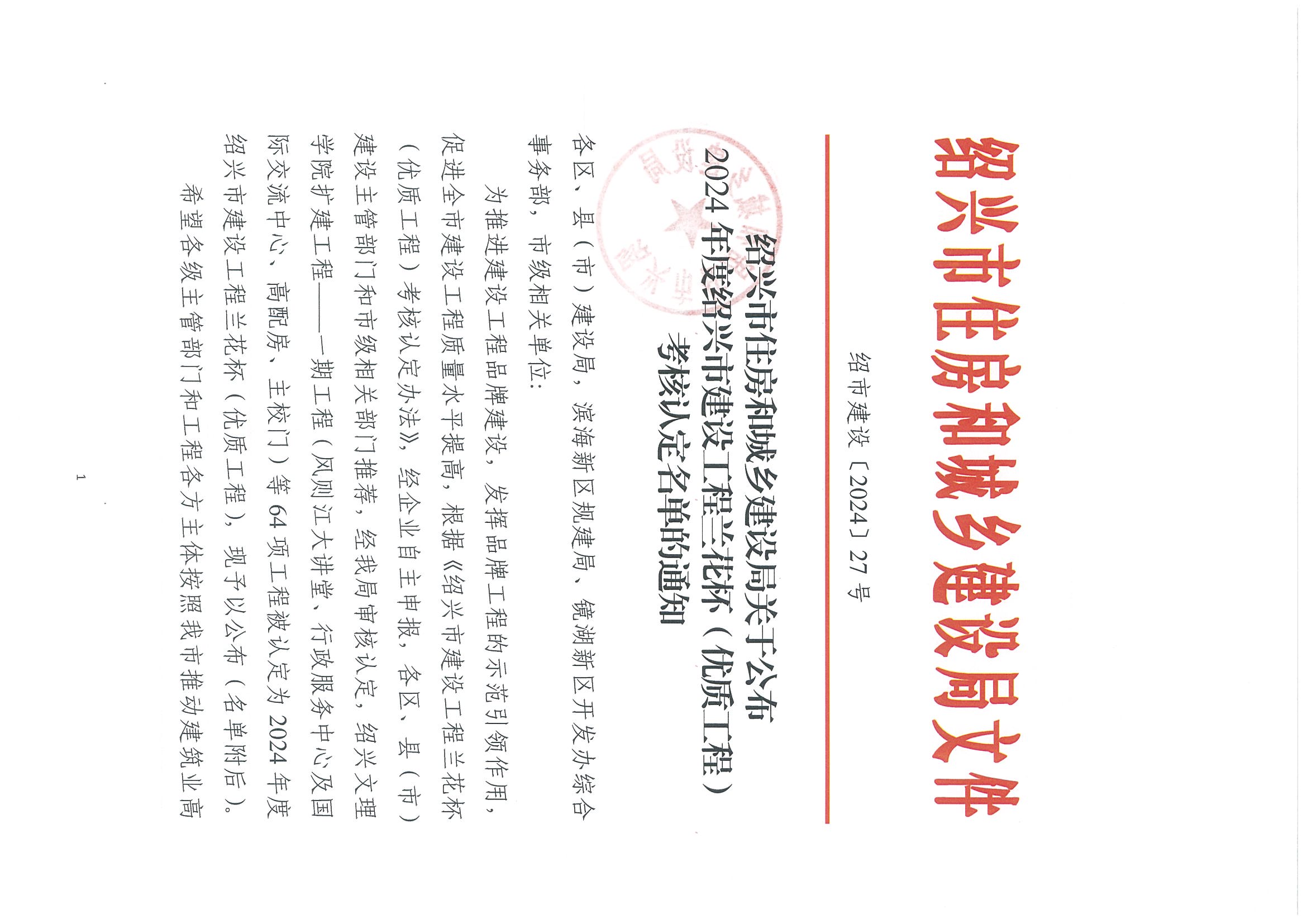近日,紹興市住房和城鄉(xiāng)建設(shè)局公布了“紹興市住房和城鄉(xiāng)建設(shè)局關(guān)于公布2024年度紹興市建設(shè)工程蘭花杯(優(yōu)質(zhì)工程)考核認(rèn)定名單的通知”。由我司承建的陽明故居及紀(jì)念館項(xiàng)目、錢清鎮(zhèn)中心幼兒園新建工程項(xiàng)目、308省道(二環(huán)西路智慧快速路)改造工程(非涉鐵段)三個項(xiàng)目榮獲“2024年度紹興市建設(shè)工程蘭花杯(優(yōu)質(zhì)工程)”。