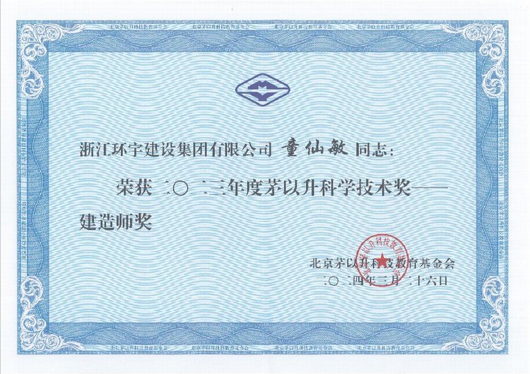 環(huán)宇集團總工程師童仙敏榮獲2023年度“茅以升科學技術獎——建造師獎”
