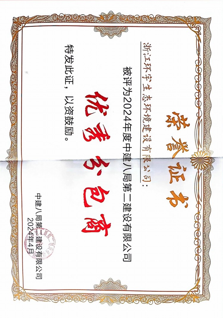 近日,環(huán)宇集團下屬子公司浙江環(huán)宇生態(tài)環(huán)境有限公司獲得中建八局第二建設(shè)有限公司頒發(fā)的2024年度“優(yōu)秀分包商”榮譽稱號。