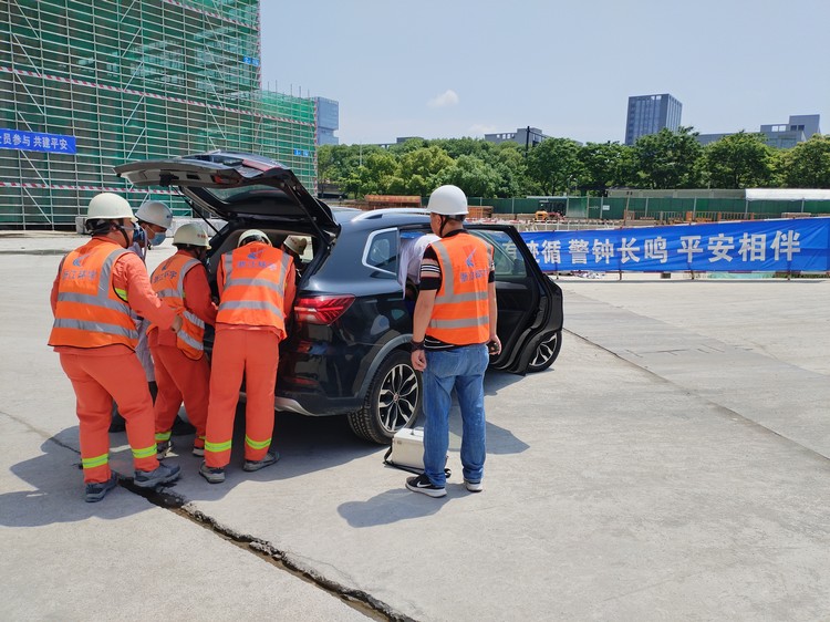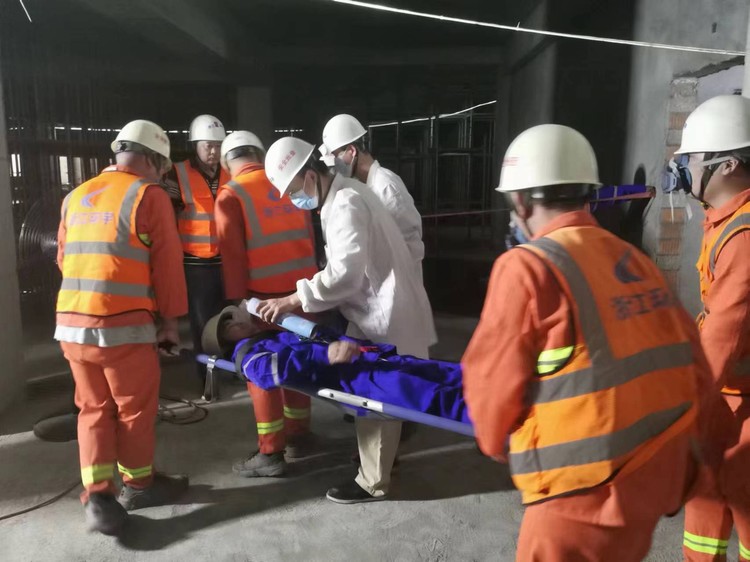 此次演練搶救小組包括保衛(wèi)組、搶險(xiǎn)組、聯(lián)絡(luò)組、救護(hù)組、后勤組、機(jī)動(dòng)組。主要內(nèi)容為工人擅自進(jìn)入地下室有限空間作業(yè),因有限空間內(nèi)通風(fēng)不暢、含氧量不達(dá)標(biāo)導(dǎo)致工人窒息昏迷。施工現(xiàn)場負(fù)責(zé)人得知事故發(fā)生后,立即組織各搶救小組啟動(dòng)搶救程序。保衛(wèi)組對(duì)現(xiàn)場做好警戒圍擋,叫走無關(guān)圍觀人員,嚴(yán)禁圍觀人員拍照;后勤組先對(duì)現(xiàn)場救援條件做判斷,使用氣體檢測儀對(duì)周邊環(huán)境氣體進(jìn)行檢測,不符合要求的場所嚴(yán)禁人員進(jìn)入,同時(shí)接好大功率機(jī)械通風(fēng)設(shè)備對(duì)有限空間進(jìn)行通風(fēng);搶險(xiǎn)組穿戴好救援個(gè)人防護(hù)裝置,迅速將昏迷人員救出,脫離現(xiàn)場,轉(zhuǎn)移至通風(fēng)良好和有新鮮空氣的地方;救護(hù)組對(duì)傷者進(jìn)行檢查,對(duì)傷者進(jìn)行緊急心肺復(fù)蘇,經(jīng)過搶救傷者蘇醒,項(xiàng)目經(jīng)理認(rèn)定受傷人員已蘇醒,傷勢尚可,可由項(xiàng)目部應(yīng)急車輛送至醫(yī)院,于是搶救組將傷者用擔(dān)架固定,抬到提前準(zhǔn)備好的應(yīng)急車輛上,醫(yī)療救援組上應(yīng)急車輛一路陪同送至醫(yī)院治療。