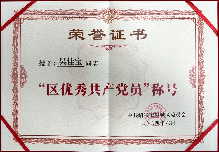 我集團(tuán)黨委副書記吳佳寶同志獲評越城區(qū)優(yōu)秀共產(chǎn)黨員。