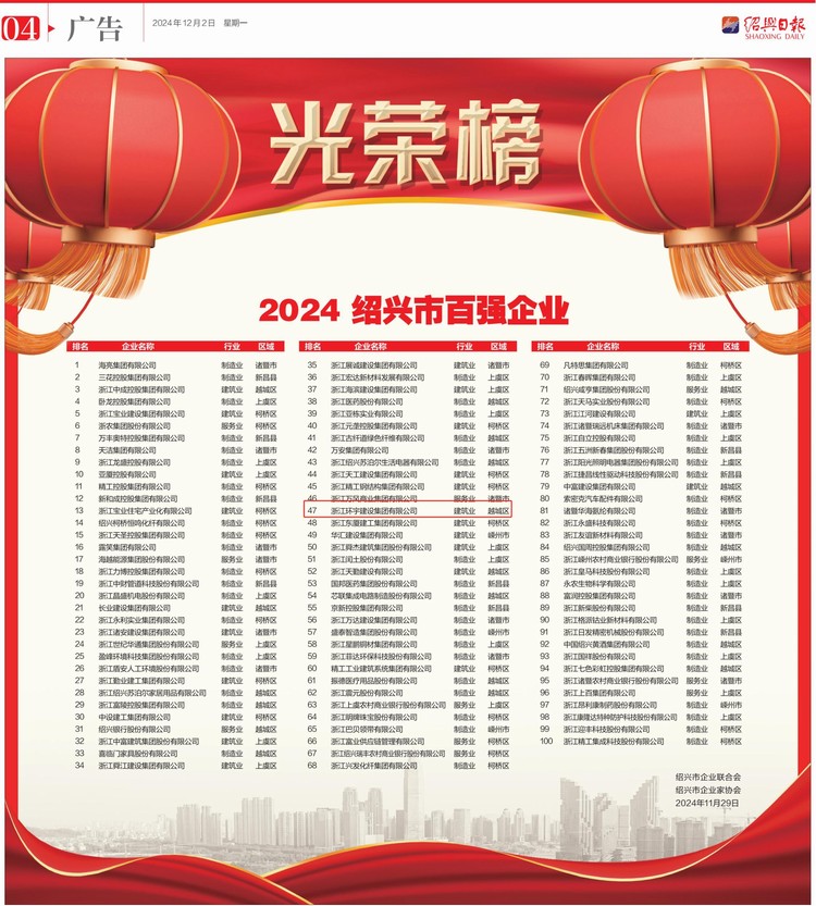 【概要描述】近日,紹興市企業(yè)聯(lián)合會、紹興市企業(yè)家協(xié)會公布了2024紹興市百強企業(yè)榜單。環(huán)宇集團憑借卓越的業(yè)績和持續(xù)的增長動力,再次榮獲紹興市百強企業(yè)的殊榮,位列第47位。