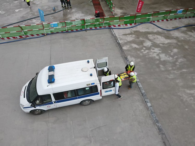 10點25分,高處墜落事故應(yīng)急演練正式開始。演練模擬了一名“作業(yè)人員”在施工過程中因未使用安全帶,從二樓墜落地面。事故發(fā)生后,現(xiàn)場人員立即通知安全員,安全員迅速向項目經(jīng)理匯報。項目經(jīng)理立即啟動應(yīng)急救援預(yù)案,組織救援小組趕赴現(xiàn)場搶救,并同步撥打120急救電話。幾分鐘后,120救護車抵達現(xiàn)場,醫(yī)護人員對傷者進行了初步檢查與急救,確認(rèn)傷勢嚴(yán)重后,后勤組迅速將傷者抬上救護車,送往就近醫(yī)院進行進一步治療。